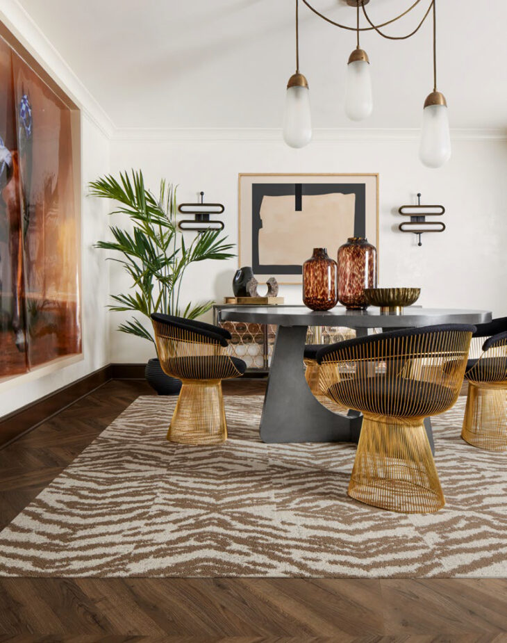 - Into The Wild: An area rug style that is sure to bring the glitz and glamour to any interior space. Let your imagination run wild with a boldly refined animal print, offered in Wheat and Black.