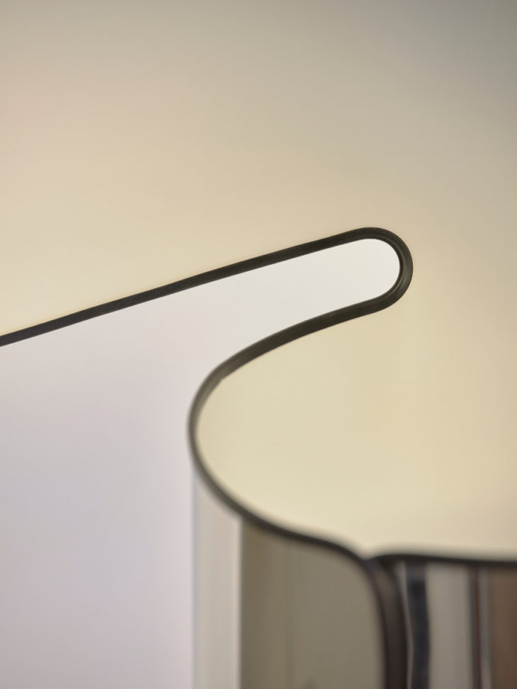 The re-edition of Chiara uses cutting-edge technology and will introduce two models: the classic floor lamp in stainless steel with black edges and a new, smaller table model in a variety of finishes – aluminum with an anthracite edge, dark grey with olive green edges, and pink gold with red edges.