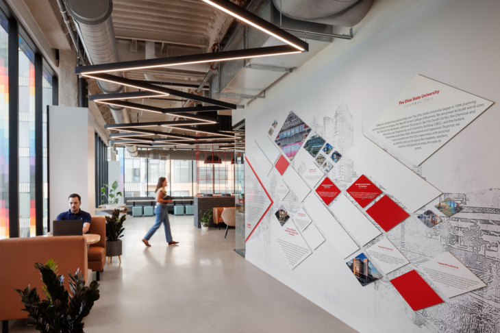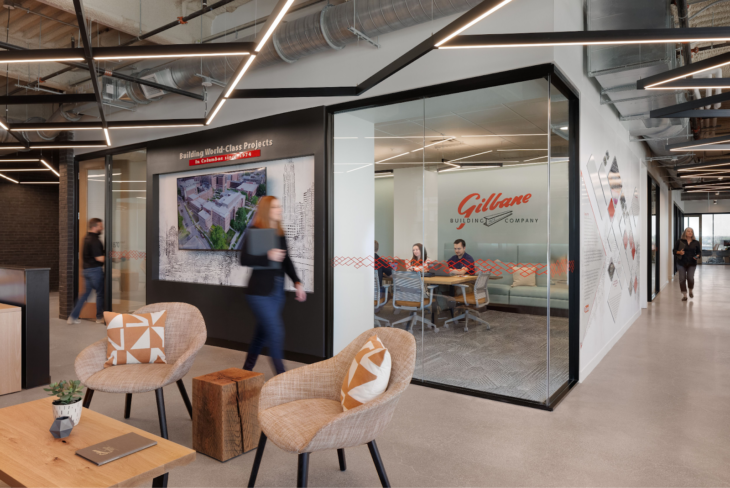 - A history wall showcases the extensive work Gilbane has completed in the Columbus region, highlighting the company’s local roots, industry leadership, and people-first culture.