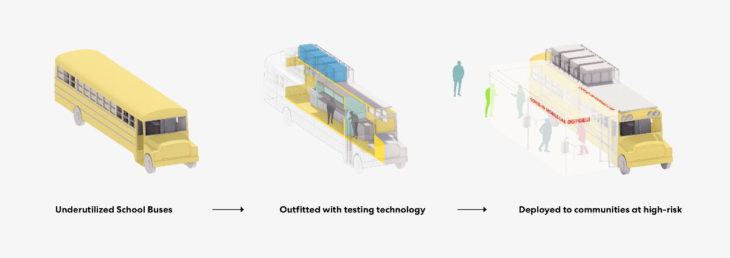As the world battles one of the worst global health crises of recent memory, public health experts agree that insufficient testing and significant lag times for test results are limiting the ability to treat and track the spread of the virus. Additionally, around the world, under-served, lower-income and homeless populations are being disproportionately impacted, both economically and medically, by COVID-19 and face greater challenges in accessing testing and treatment. Mobile testing labs would help address these existing inequities, reduce the risk of contamination en route to or at a larger medical facility, and put to good public use a fleet of currently idle school buses nationwide.
