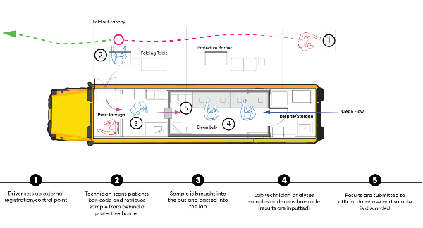 To support lab technicians, the rear of the bus could include a respite area, a gravity-based hand washing sink, a refrigerator for water and lunches, seating, and storage options for personal protective equipment. In addition, a clean flow process could be implemented, and a negative air pressure system created, to minimize the risk of environmental contamination within the lab space. Generators could be placed on top of the bus to provide electricity.