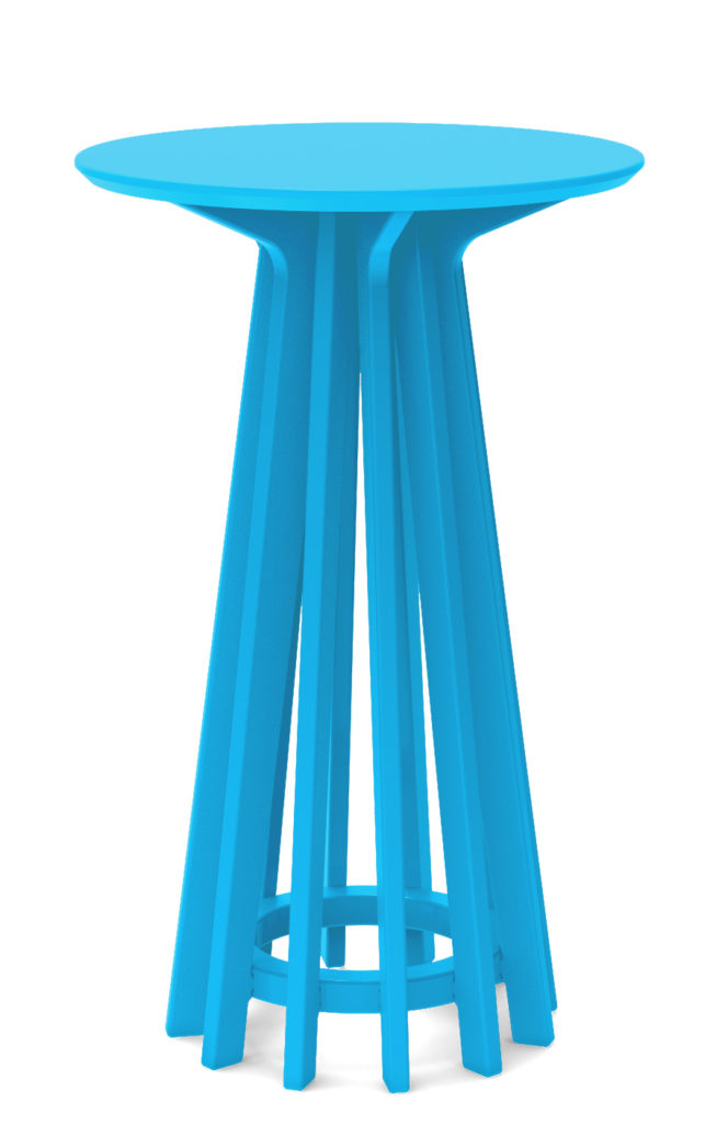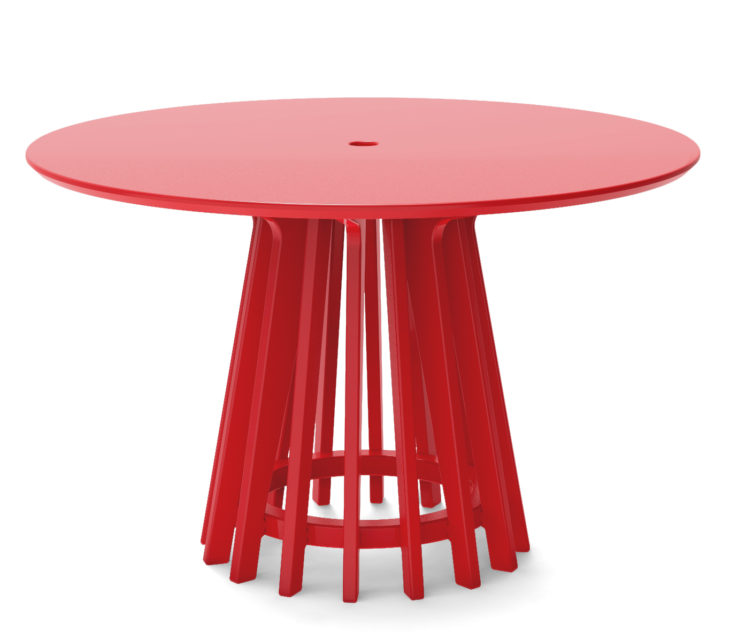 The Good Company table comes in a dining size (with hole for an umbrella) and two sizes of bar height tables (26″ and 32″), all available in Loll’s nine bold colors and designed to make a statement with its eye-catching yet airy pinwheel base.