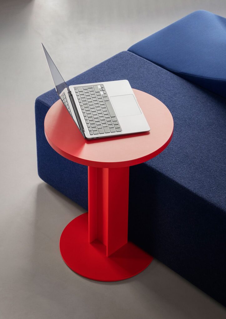 In contrast to the industrial beam legs, the HEB tabletops come with a matte, tactile, laminate surface wrapped in a glossy ABS (an opaque thermoplastic) ribbon, available in seven colors that you can mix and match for the table base, top, and edge band. This combination of materials brings a warm, human, and overall comfortable feeling across the range. Lounge and Standard height options are available in three different tabletop diameters: 16.5 inches, 27.6 inches, and 35.4 inches.