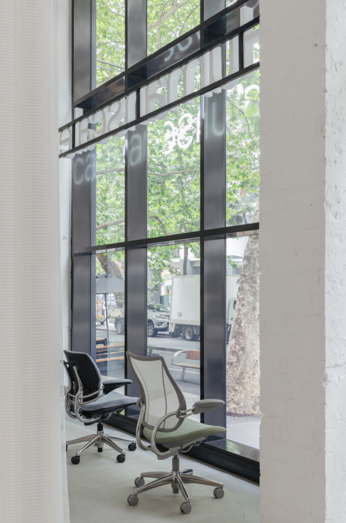 The Pitt Street location places Humanscale at the centre of Sydney’s design and business district, surrounded by leading architecture studios, interior design practices, commercial clients and creative professionals. The showroom’s prominent street presence and expansive glazing reflect the building’s original architectural intent, creating a strong visual connection between the interior and the city beyond.