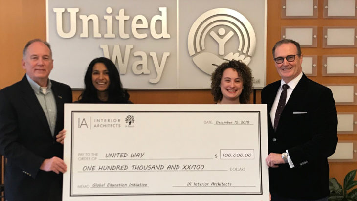 As we end 2018, IA Interior Architects is thrilled to announce a year of successful fundraising in partnership with United Way. On Dec 15th, IA presented United Way with a check for $100,000, raised by each IA office in collaboration with their United Way chapter. The funds raised are dedicated to United Way’s education initiatives, which include Drive, United Way Massachusetts Bay’s early education program that screens children for developmental delays, Youth Venture, United Way Kings County’s social entrepreneurship program for kids, and Vello, United Way Valley of the Sun’s online literacy tutoring platform.