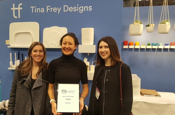 Tina Frey, featured at center in the photo with two IFDA judges, hand-sculpts her designs in San Francisco with an emphasis on simplicity and function. “Soft forms — reminiscent of organic shapes — the ocean, textured rocks and beach glass are some of the things that inspire my work,” said Frey. All pieces are handmade of food-safe, lead-free resin.