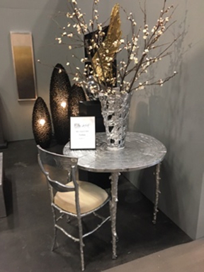 The handcrafted, polished aluminum Café Table from Michael Aram’s Enchanted Forest Collection couldn’t go unnoticed. Said Aram, “For me, the shapes conjure a sense of freshness and fragility. At the same time the textures represent a metaphor for life itself…growth, vitality, pulsation…What I enjoy about these furniture pieces is that in a way they are ‘slices’ of nature, small vignettes of the forest. It is fascinating to imagine the outside world infiltrating my interior spaces, as if the room is being gently consumed by nature.”