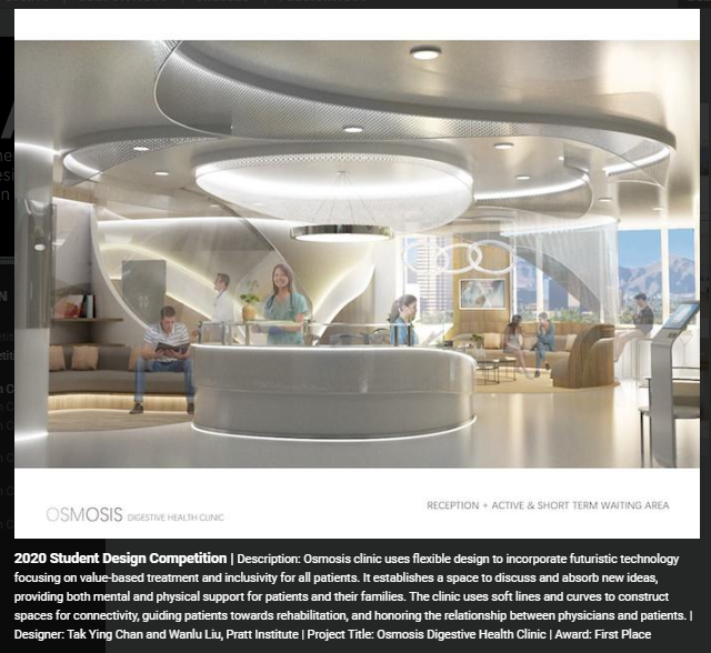 IIDA is proud to announce the winners of the 2020 Student Design Competition, sponsored by OFS and Carolina. This annual competition provides emerging professionals with the opportunity to showcase their work and gain exposure in the interior design industry. This year’s competition brief challenged participants to design a fictitious digestive health clinic for a physician’s group specializing in gastroenterology.