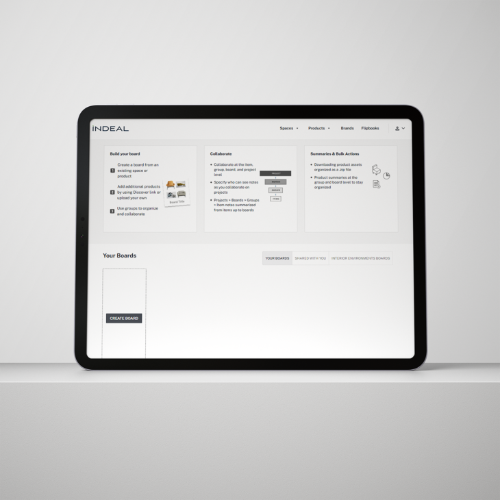 INDEAL Spaces’ Boards feature is an exclusive benefit for INDEAL Dealer Members and Brand Partners. An interactive demo was created to walk users through the experience. Those in need of a login can contact Sondra Caddell at scaddell@indeal.org for assistance.