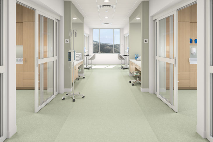 With two vinyl sheet styles, Spike-tacular™ and Bloom With a View™, the Desert Scapes collection meets the specific needs of patient rooms and other healthcare spaces. Visually seamless due to their monolithic installation, both styles are engineered for design and budget flexibility while providing durability that stands up to the rigors of busy healthcare environments. Spike-tacular features an irregular horizontal texture that recalls the drifting patterns of sand, while Bloom With a View layers the texture of Spike-tacular with a floral treatment for a denser feel.