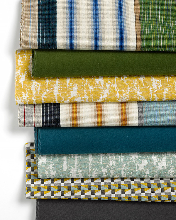 This performance collection balances abstract and structural elements beautifully. Destination has four bleach cleanable upholsteries featuring Stripe It, a full-width repeat épinglé construction suitable for outdoor use that is also antimicrobial. Utopia is a budget friendly indoor/outdoor velvet available in 20 colors, while Vice Versa and Retreat offer pattern of varying scales. Vice Versa is a small but mighty geometric and Retreat is a calming midscale organic design. All have performance attributes like stain resistance and excellent light fastness. Stripe It, Retreat and Vice Versa are made in the USA.