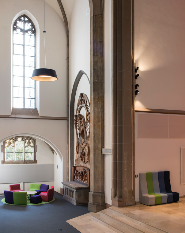 Installed within the Church’s nave, the furnishings provide an acoustically sound retreat to counter the high ceilings of the space. Bright in hue and simple in shape, both Dilim and Suri add an eye-catching detail that offer an unusual contrast to the traditional design of the church’s old wooden stalls.