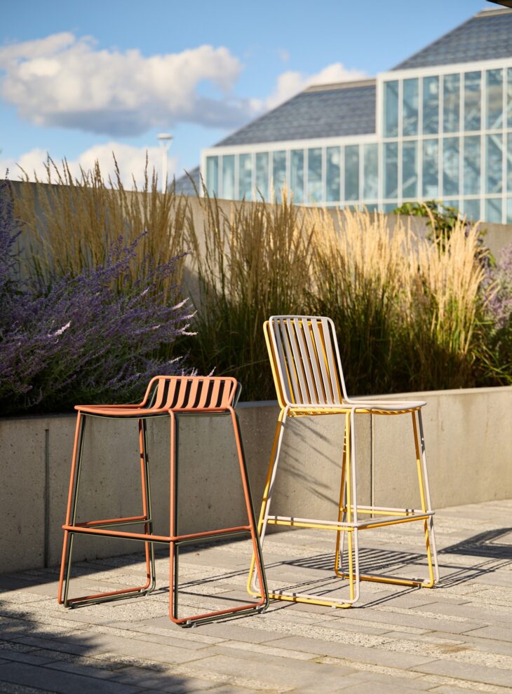 The standing-height stools mark a notable addition to the Landscape Forms portfolio. “There’s been increasing demand for well-designed outdoor stools that blend comfort, durability and adaptability,” says Heiser. “These fit nicely in our portfolio and open up great opportunities in hospitality and rooftop applications.”