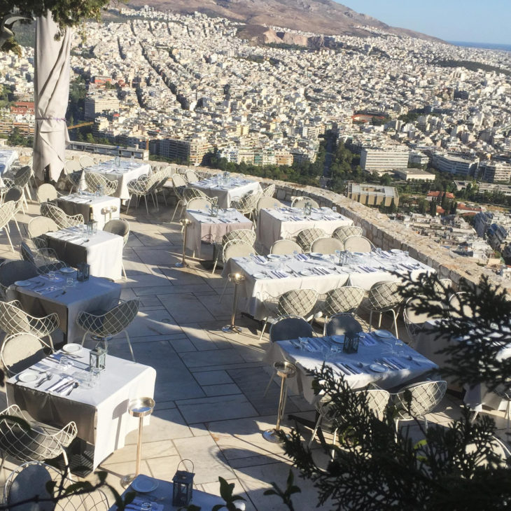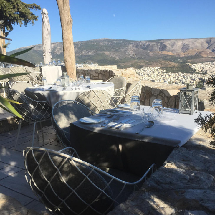 ORIZONTES RESTAURANT, Athen / Greece – The Piña chair with its characteristic design at the Orizontes Restaurant. Located at the hill of Lycabettus, Athen’s highest peak, it overlooks the capital from 277 meters and offers a stunning view over the historic city center. Modern decorations of soft colours and simple lines characterize the internal areas, while the revitalizing outdoor space blends the atmosphere with natural materials and tones. The Piña Chair with white frame and upholstery in Polyhedra fabric grey mélange harmoniously combines Mediterranean gastronomic traditions with a modern aesthetic.
