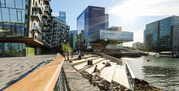 In this gorgeous Tishman Speyer photo at the top of the page, two past Mark Richey Woodworking projects representing both residential and commercial work appear side by side in the Boston Seaport District. Designed by SHoP Architects, the residential condo project, Pier 4, featured Ipe rain screens, soffit, fascia and ha-ha wall as well as matching interior work. Turner Construction Co. was the general contractor. See more Pier 4