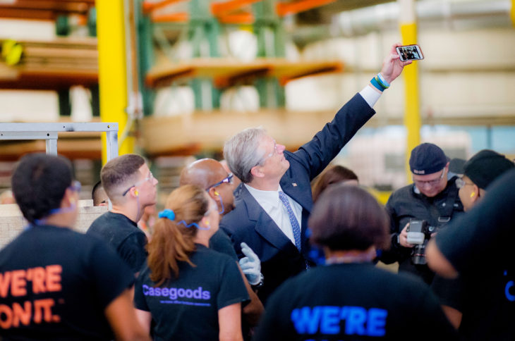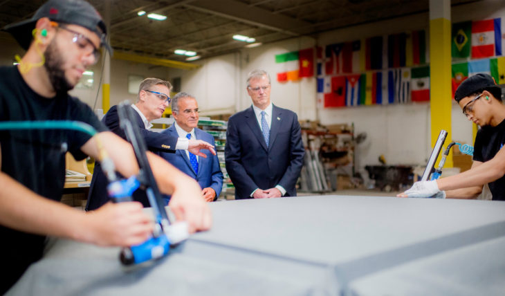 Governor Charlie Baker visited AIS, the largest manufacturer of commercial office furniture and seating in New England, on Wednesday as part of National Manufacturing Month celebrations. During his visit to the Leominster-based company, Governor Baker toured the manufacturing floor, met employees and presented a proclamation declaring October to be Manufacturing Month in Massachusetts.