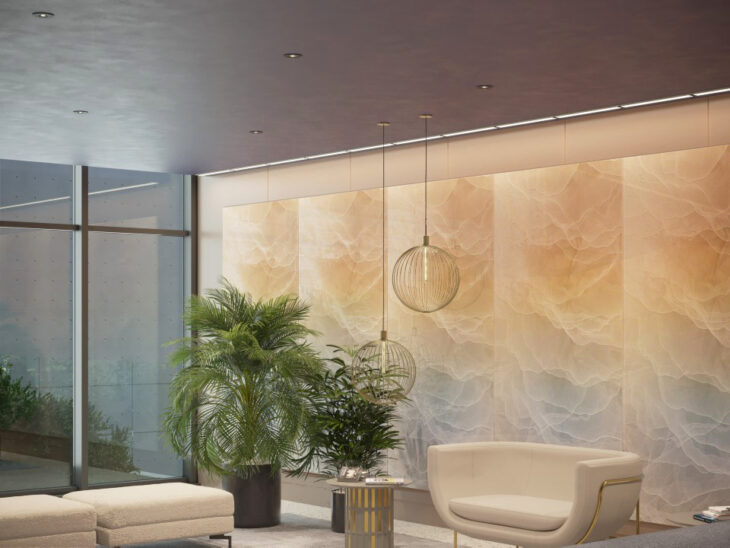 Móz’s new Graphix patterns showcase innovative metal solutions, which combine the luminosity of signature Móz grains with digital imagery to create a striking product. Standard sheet sizes are available in 4′ x 8′ and 4′ x 10′ on 0.040″ – 0.250” solid core aluminum, with options in Perforated, Laser Cut, Engraved, and Corrugated aluminum to support a variety of design applications. Available by the sheet or as ready-to-install product solutions, the collection can be specified for columns, dividers, walls, ceilings, and exterior applications, making it a versatile choice for commercial and hospitality environments.