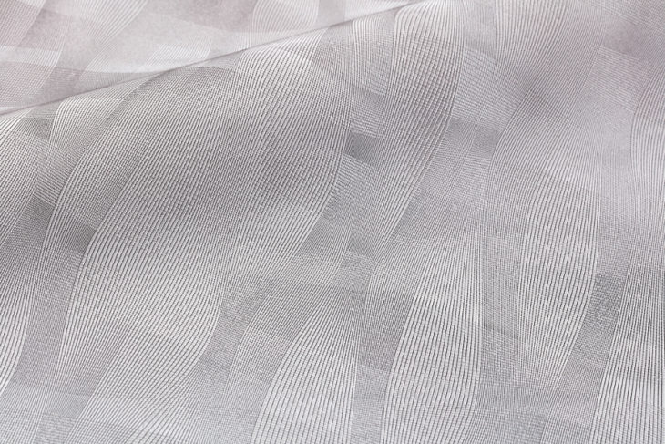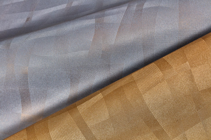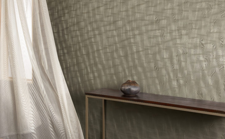 Hove. A crisp, flowing, yet organic woven netting textural design, highlighting the multi-dimensional layering of sheer netting woven fabric. Hove provides a luxuriously bold and dramatic wall treatment, when splashed with light, for a dramatically flowing unique wall surface.