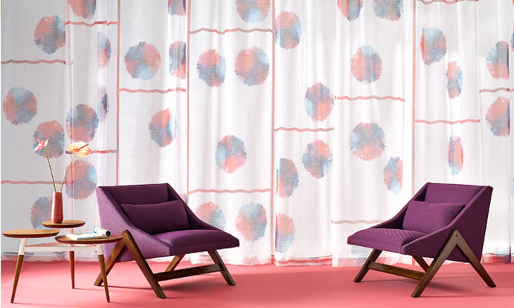 Inspired by a Dior Couture coat with organized dots in a grid, Bounce plays with the scale and rendering of the circle and grid motif on this double width sheer. Digital printing allows for subtle color shifts that create big impact. The 100% Trevira CS polyester Bounce is finished with a crushed effect adding texture and surface interest. Bounce may be paired with an opaque drapery like Bon Nuit. It is also stunning simply on its own.