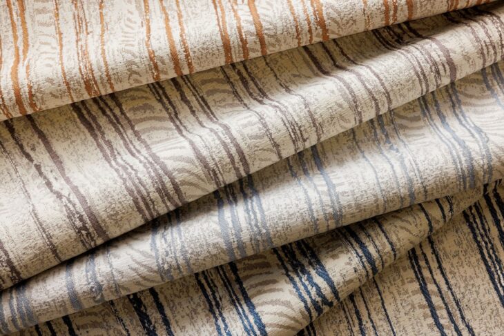 Adaptation is an indoor/outdoor upholstery inspired by the shape of footpaths on the shore after a winter snowstorm. With its sophisticated winter whites and tones of flora and fauna, this textile expresses the rawness of nature with soothing tactility. Using a soft acrylic chenille, a fluid stripe flows down fragmented areas of de-lustered acrylic, bringing a contrasted effect.