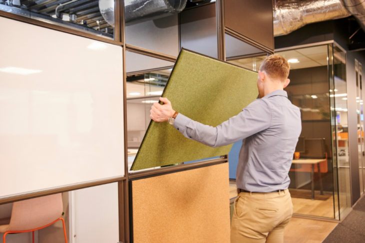 M923 panels are available in a range of colors and materials (moss, cork, absorption panels, marker boards, textiles and more). Users can easily change the panels and design the wall themselves. Because the panels are easy to change, it’s possible to adjust the appearance of a space very quickly and inexpensively. The myriad options make M923 ideal for changing up spaces from offices to restaurants to retail with style and ambiance.