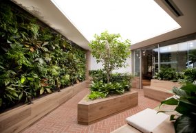But the space’s most striking design element is its oxygen room, complete with live greenery enclosed in glass. “Our oxygen room with living plant walls, specialized air quality, lighting that changes to mimic the outdoors and our 350-gallon pond in the center of our communal kitchen keep our employees productive and balanced in our fast-paced tech environment,” said Victoria Schillinger, Alarm.com’s Vice President of Human Resources.