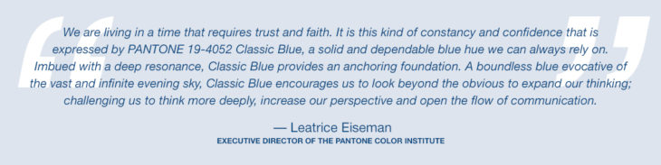 Imprinted in our psyches as a restful color, PANTONE 19-4052 Classic Blue brings a sense of peace and tranquility to the human spirit, offering refuge. Aiding concentration and bringing laser like clarity, PANTONE 19-4052 Classic Blue re-centers our thoughts. A reflective blue tone, Classic Blue fosters resilience.