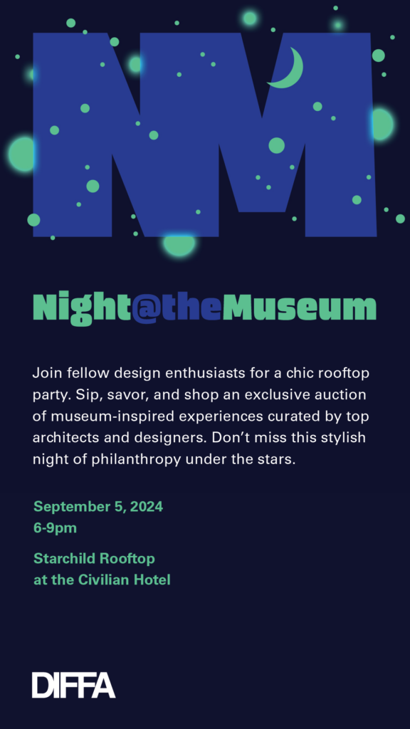 SAVE THE DATE for DIFFA’s next fabulous fundraiser: “A Night at the Museum” on September 5, 2024 on the roof at the Civilian Hotel. Stay tuned for more details and to purchase tickets.