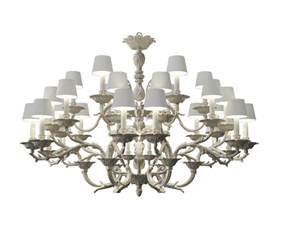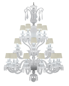 The ornateness of the original Bohemian chandelier is refined, retaining its sense of grandeur but using opaque glass and colour accents to soften the impression, and bring it further into today’s contemporary culture. The frosted surfaces mean the piece fits comfortably into intimate settings, whilst none of the splendour of the original is lost. A collection of lampshades compliment the pearly tones of the glass and offer opportunities for various interior schemes.