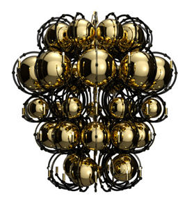 The geometry and shape of the original, classical, Maria Theresa, is completely reimagined, although retaining the same construction principles, into a highly affecting contemporary piece, striking in its simple yet monumental design and bold colour scheme. The use of elaborate forms is restricted, letting the core concepts of the piece resonate with luxurious vibrancy, made possible through exquisite glass work and finishes. The light from the discreet luminaires is reflected in the rich gold spheres, projecting warm reflections, and creating a sense of quiet majesty.