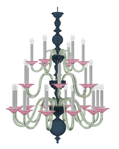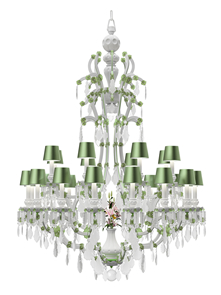 Using white glass and colouring the steel structure, adding coloured glass elements and coloured lamp shades, combine to achieve a completely contemporary light piece. Introduced in several new colour schemes and complemented by its softer appearance, the chandelier now suits a wider range of interior spaces, bringing fresh luxury and a sense of light-hearted splendour. Traditionally, the steel structure was embodied in clear glass. Now, it is embodied in coloured glass inspired by nature, which is visible from the edges and sides, adding a further level of interest – the experience of colour changes as you move around the chandelier. Opaque white glass both gently diffuses the light, and the impression that the chandelier gives to the room.