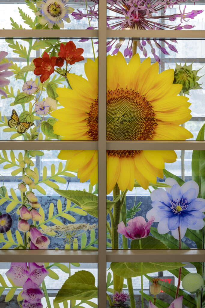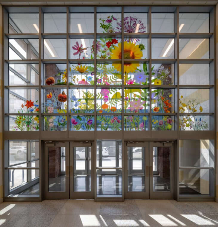 Spanning more than 24 feet wide and 14 feet high, “Brighton Botanical” is a vibrant glass mural on digitally printed interlayer that showcases 53 different varieties of colorful, blooming flowers. To achieve the desired aesthetic, D2G ceramic frit paint was applied on the #1 surface, which was laminated with ¼” Low Iron PGI opaque interlayer in between the glass to create depth and make the bright, saturated colors shine. The artwork is visible from the street, the school lobby and the second floor, inviting students and visitors alike to explore the mural’s beauty and draw aesthetic, scientific and literary inspiration from the surrounding world.
