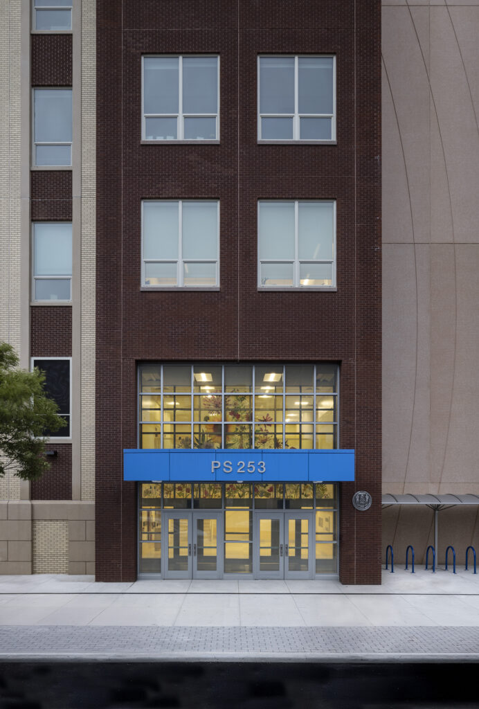 The wide array of flowers symbolizes the rich diversity of students at P.S. 253. To create the mural, Whitney Barnes researched plant species from around the globe and chose only those that thrive in Brooklyn. “The symbolism of each flower played an important role in my selection process,” states Whitney Barnes. “Several flowers, such as echinacea, have important medicinal properties; others, like the lotus, are significant in literature; and the sunflower, an essential food source for both humans and animals, symbolizes strength, resilience, happiness and positivity.”