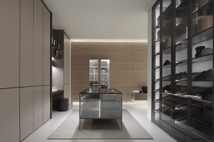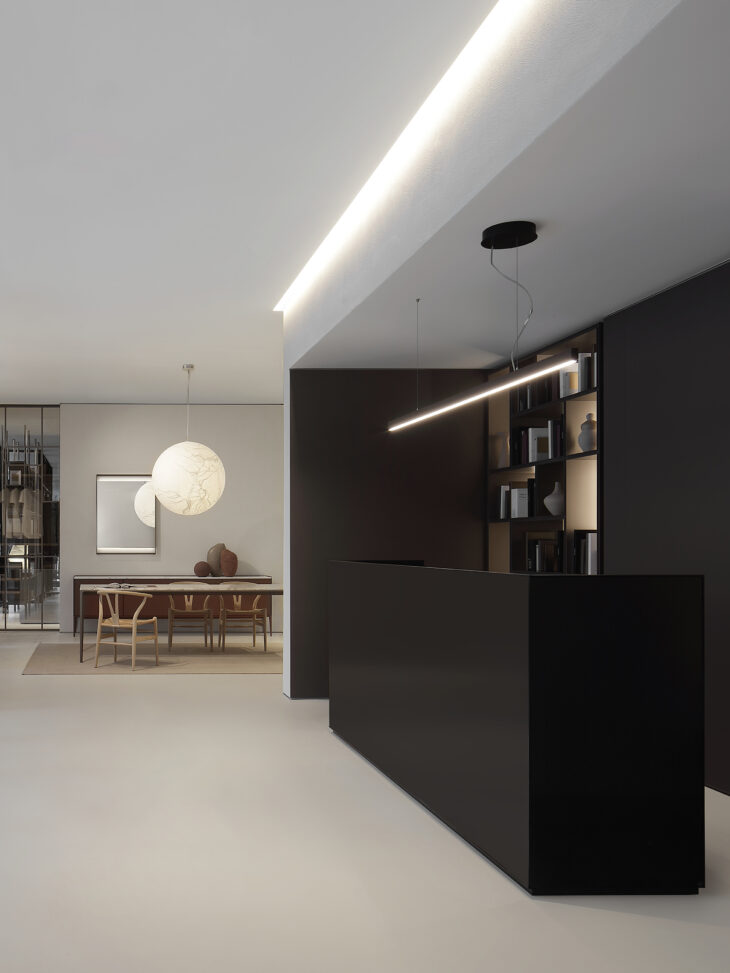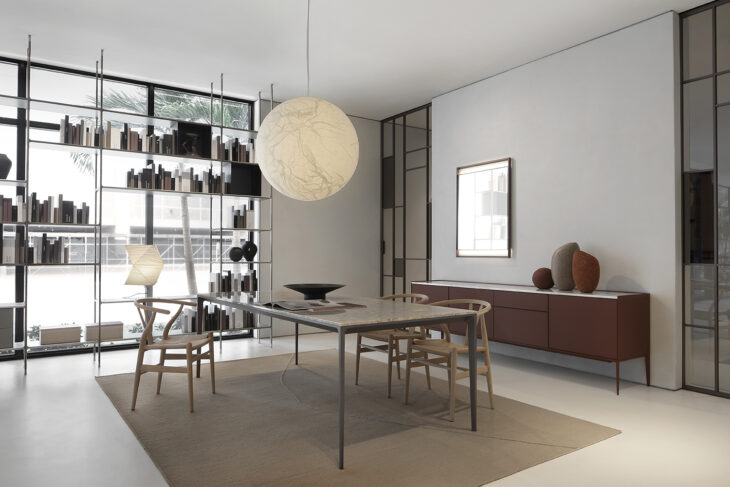 Among the key products on display is a curated selection of tables and complementing designs from the Rimadesio Collection: Modulor boiserie system takes center stage, covering almost the entire showroom’s walls with finishes in sound-absorbing fabric, Litech, wood, and raffia. The Rialto collection is showcased through coffee tables and sideboards, while standout tables include Manta and Long Island. The night area features an extensive Cover walk-in closet system, complemented by Alambra and a small home studio corner created using the Self system integrated into Modulor.