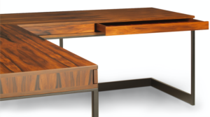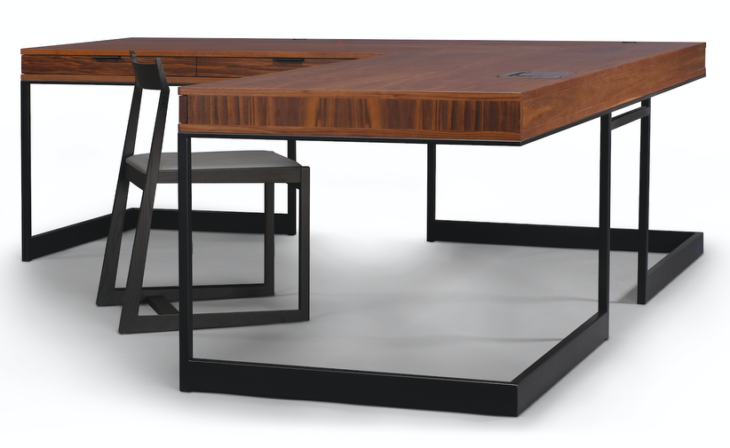 The fully-customizable Wishbone Executive Desk features a large-scale ‘L’ shape, incorporating the Wishbone aesthetic of daring cantilever and streamlined proportions. The new desk includes a clear span on the ‘user’ side for unobstructed movement, concealed power/data and wire management options for uncluttered and seamless technology integration, integrated keyboard pull-out drawer, and access to the full complement of Skram’s exquisite material selections for both the woodwork and the metalwork. Options for customization of material, scale, and configuration make the Executive Desk well-suited for settings where perfectly tailored solutions are required.
