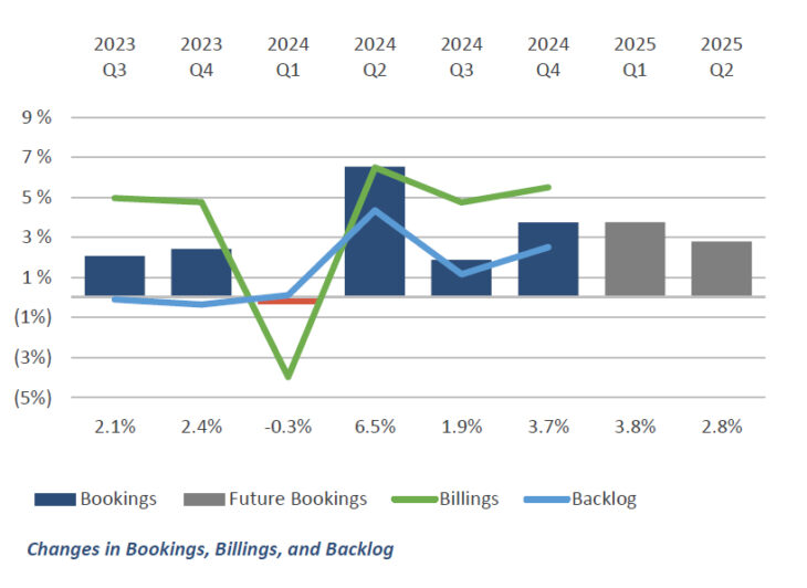 - Billings and Backlogs growth rates both increased between Q3 and Q4, from 4.8% to 5.5% and from 1.2% to 2.5%, respectively.