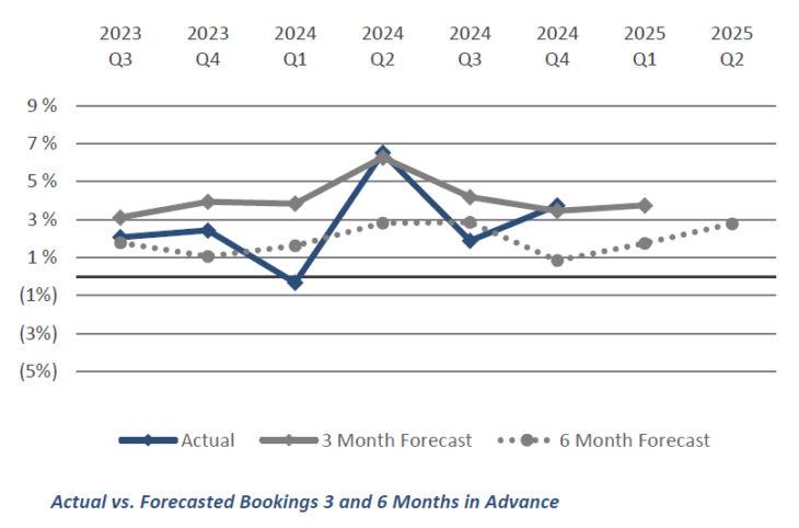 Upon reviewing this quarter’s survey responses, Solomon Coyle principal Shelley Rosetta shares, “Seeing the actual bookings growth of 3.7% exceed the Q4 forecasts, and dealers’ optimism with projected growth rates of 3.8% for Q1 2025 and 2.8% for Q2 2025, highlights the positive mindset of the distribution channel’s market outlook as we enter the first half of 2025.”