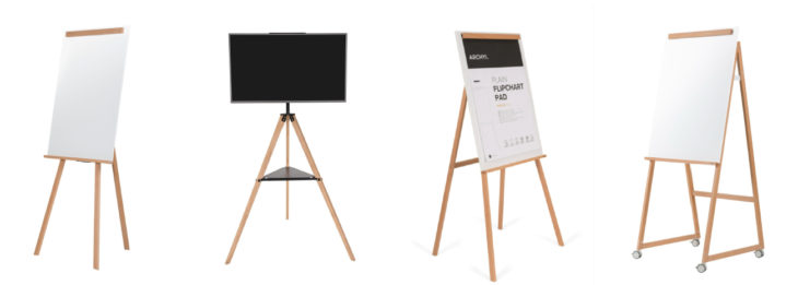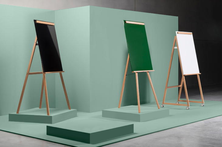 Available in three colors—White, Black, and Green, which is reminiscent of classic chalkboards—and four style variations—a tripod, quadpod, four-wheeled mobile board, and an LCD stand—ANGOLO elevates and mobilizes the traditional whiteboard while maintaining functionality. ANGOLOʼs writing surface is also non-ghosting, which keeps the board looking good as new after every erasure.