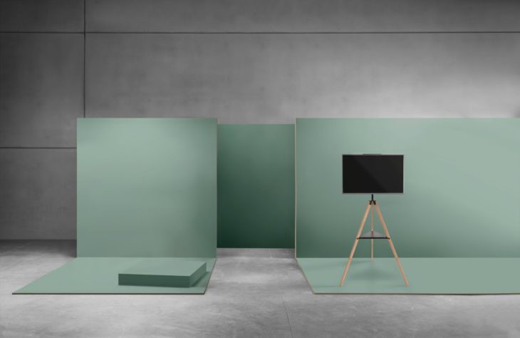 Left to right: ANGOLO Quadpod in Black, ANGOLO Tripod in Green, and ANGOLO Mobile Easel in White.
