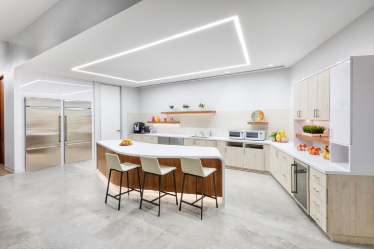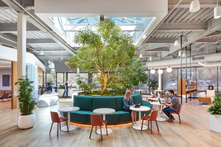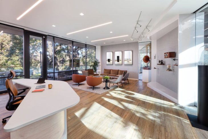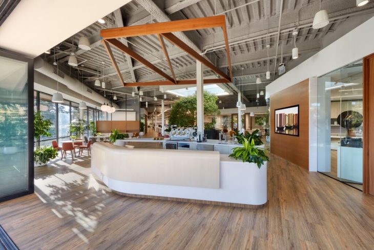 āThe [Ember] Founder really wanted the space to feel really clean,ā stated Alexandra Mitrovich, Tangram Sales Representative. āA lot of the design details are white and black, and there are a lot of warm woods. The goal was to create a space that was very open, inviting, and more natural-feeling, which is why we included a real tree in the office.ā