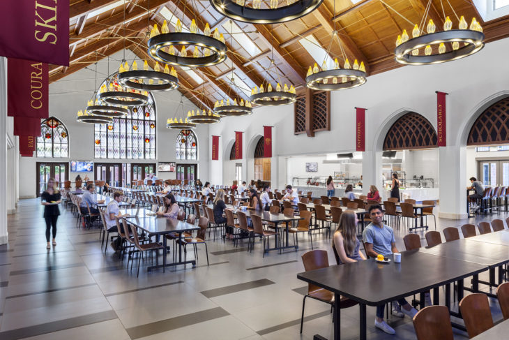 With 1.25 million square feet in six buildings spread over 15 acres, the $700-million project increases the universityâs University Park footprint by nearly a third. Residential college suites are on the upper floors, with retail on the ground level. The A-frame dining hall features custom stained-glass windows and gothic-style seating.