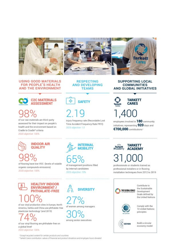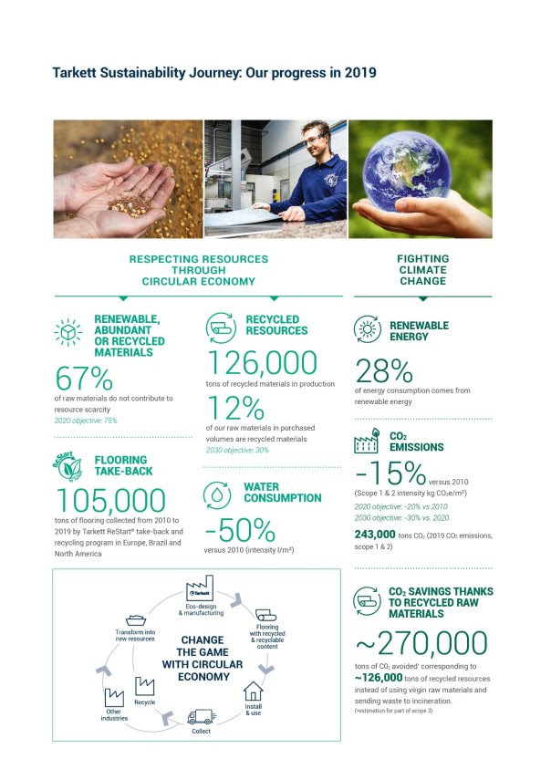 Tarkett, a worldwide leader in innovative and sustainable flooring and sports surface solutions, has released today its 2019 Corporate Social & Environmental Responsibility (CSR) report, now known as the declaration of extra-financial performance (DPEF). Fully audited by an independent third-party organization, KPMG, this report showcases the company’s circular economy commitment, demonstrating how Tarkett has not only reduced its environmental footprint, but also contributed positively to global societal challenges. Download the 2019 CSR Report.