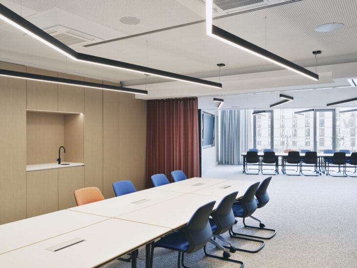 The office is a mix of open-plan workspaces, lounges, quiet rooms for deep work, a bistro, and several multipurpose conference rooms. Conference rooms K1 and K2, which are separated by a mobile glass partition, are a particular focus. If required, this partition can be opened fully to create one single large space, making it ideal for assemblies, hybrid conferences, or large meetings with lots of attendees. “Our goal was to create workspaces that reflect our association’s desire to have its finger on the pulse. We wanted the premises to be agile, user friendly and future proof,” comments Dr. Joachim Bühler, director of the TÜV Association. “Wilkhahn didn’t just understand our remit, but translated it into furniture and spaces that made our employees’ and guests’ day-to-day lives noticeably easier.”