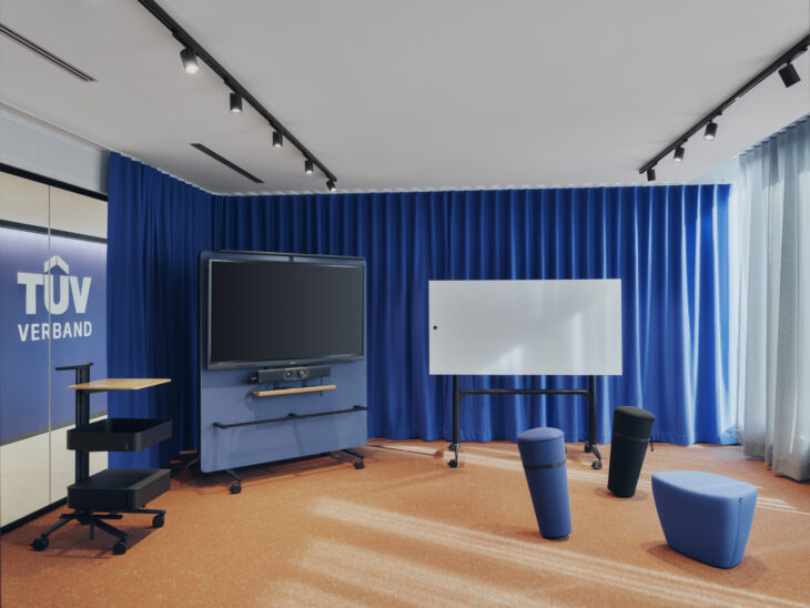 Customized requests were met regarding the design of surfaces and covers. Shades of blue echo the TÜV Association’s corporate design and create an attractive link between the architecture, brand, and furniture. Occasional pops of color in salmon and turquoise are also scattered about.
