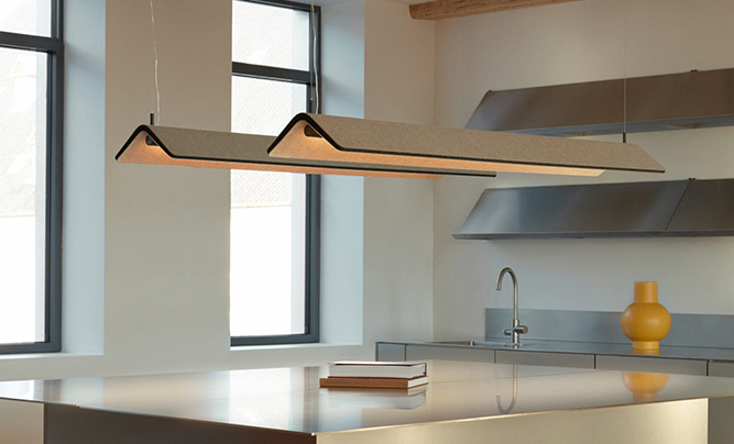 Vika Collection, designed by Khodi Feiz, is a captivating fusion of artistry and functionality. Crafted as both a sculptural floor screen, offering options with or without integrated lighting, and an elegant ceiling light fixture. Vika emanates a soft, ambient glow while adeptly managing both low and high-frequency noise levels. “It’s another way of thinking about sound and light,” says Feiz. Vika can be used to reimagine larger spaces into more intimate areas, creating a better soundscape and a quieter atmosphere – perfect for open-plan offices, co-working spaces, and lobbies. The Vika floor screen is available in two dimensional versions: a smaller, oblong one evocative of a light pillar and a larger one that functions as a room divider. Vika is available in four colorways, lighter colors provide brighter light, while darker colors provide more subdued lighting.