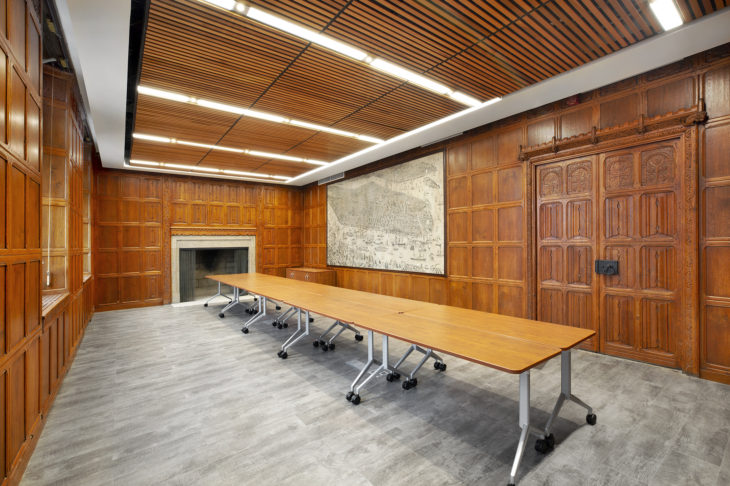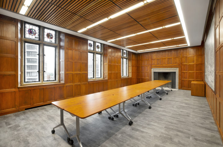 All office floors include a combination of open workspace, private offices, conference rooms, and employee amenities. The 10th floor has several existing conference rooms featuring teak panels and trim that were installed as part of the original 1923 building and refurbished prior to the current renovation. To reflect the building’s past, Urbahn designed new teak paneling on the exterior of the conference room that closely matches the original 1923-vintage millwork. Within the historic conference rooms, the Urbahn team specified new luxury vinyl tile (LVT) flooring and Armstrong Woodworks Grille Tegular natural wood ceiling panels with imbedded linear lighting fixtures that visually complement the original teak wall paneling.