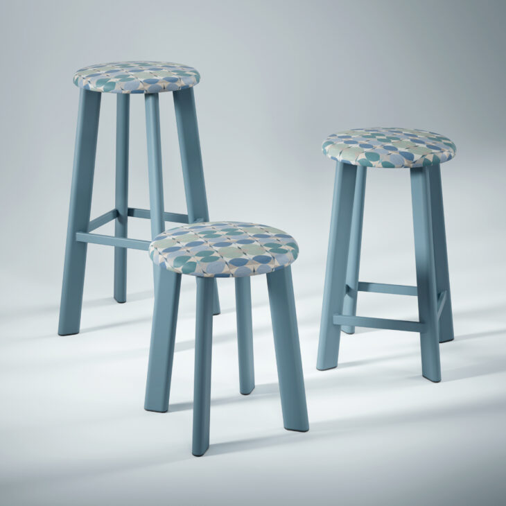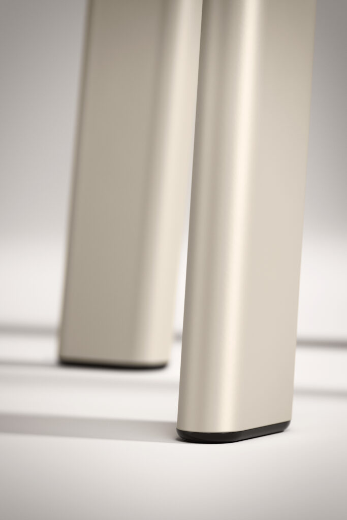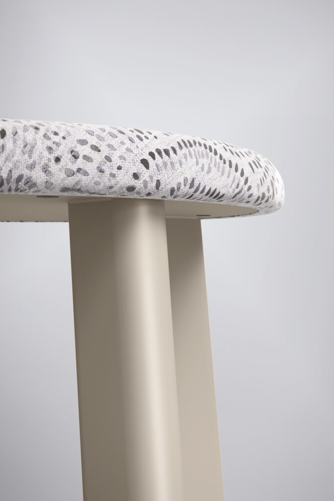 Every detail of Rai intentionally addresses durability and cleanability. The stool’s closed-loop oval leg and tapered upholstered seat create a soft, continuous form while delivering exceptional strength and comfort. The fully wrapped upholstered seat eliminates stitch seams and conceals the textile edge, reducing catch points for debris. Full-profile black end cap glides contribute to the seamless design, reinforcing Rai’s smooth, uninterrupted silhouette.