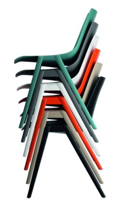 The shell and frame are a consistent unit with precise and soft lines that suggest the chair is seamless. The armrests are connected in a slightly offset manner, exactly mirroring the sloping rear legs. Placed in a row, the chairs leave a very crisp and well-ordered impression. The way all the parts are made and joined to produce a harmonious end result sets new standards in the processing of plastics and places stringent demands on the material and manufacturing technology.