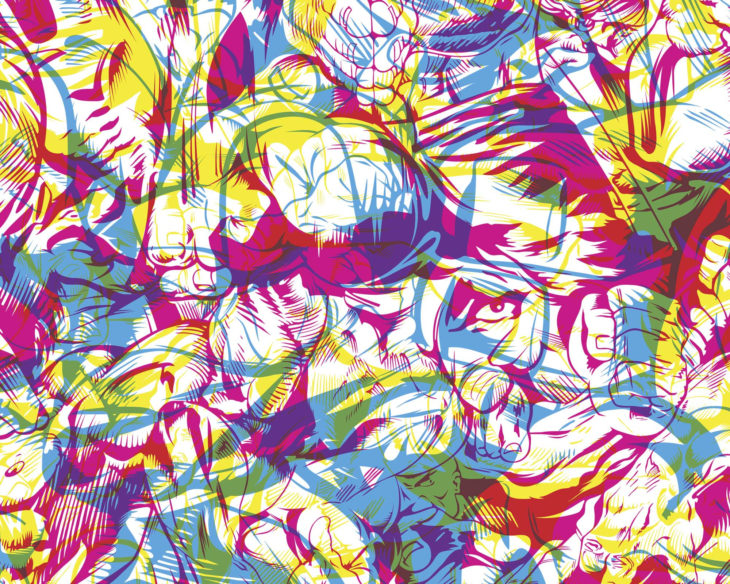 Super Matter 24 and Super Matter 6: These works are interpretations by ASVP of superheroes and pop iconography reimagined as Pop Abstract Expressionism through dynamic shapes with bold color and movement. ASVP is a Brooklyn-based artistic collaboration between Simon Grendene and Victor Anselmi that has become internationally known for creating graphic images with nods to advertising, as well as pop and comic book culture, often including layers of organic abstraction.