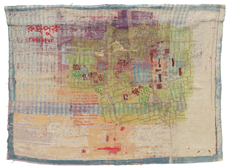 Anna Heringer’s work shows the masterplan of Rudrapur, Bangladesh embroidered over an upcycled sari blanket representing the high level of sustainability in the area; ponds bamboo is the main material for housebuilding and people use their gardens for food production. Highlighting this approach, the women of Rudrapur stitched together vernacular and modern mud-bamboo structures to prove that quality of life is based on creativity and elevating the existing, not on material consumption.